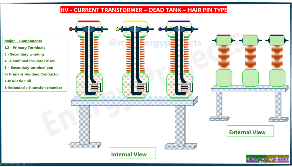 In a dead tank CT, the main body or tank of the transformer is grounded, meaning it does not carry high voltage. The live high-voltage conductor passes through an insulated bushing inside the grounded tank, which houses the core and secondary windings. This is in contrast to a live tank CT, where the tank is energized & Where the real core of the secondary terminals will be accommodated