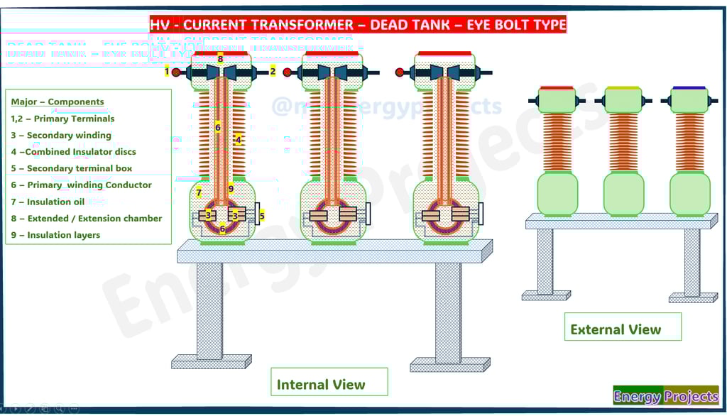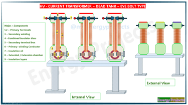 In a dead tank CT, the main body or tank of the transformer is grounded, meaning it does not carry high voltage. The live high-voltage conductor passes through an insulated bushing inside the grounded tank, which houses the core and secondary windings. This is in contrast to a live tank CT, where the tank is energized & Where the real core of the secondary terminals will be accommodated
