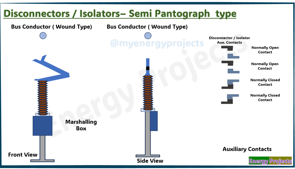 Auxiliary contacts are secondary switching contacts used in conjunction with primary switching devices like disconnectors or circuit breakers. They provide status signals (open or closed) to control systems or indicator panels. These contacts do not carry load current but help in automation and monitoring. They are essential for interlocking, safety logic, and remote supervision. The number of NC, NO , NOC ,NCO depends based on the specific requiremnets. You can see the operation of the Auxiliary contacts .