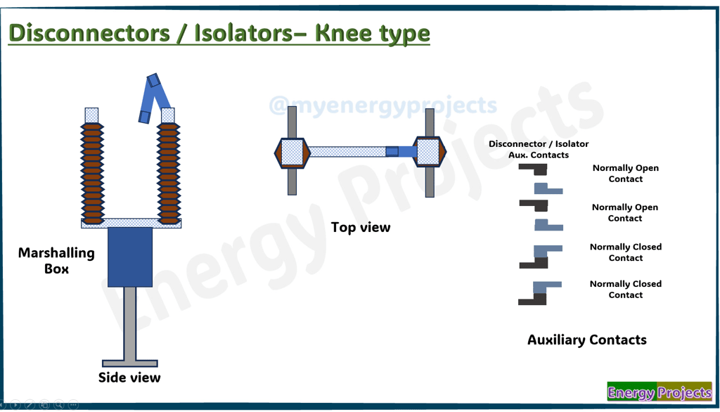 Auxiliary contacts are secondary switching contacts used in conjunction with primary switching devices like disconnectors or circuit breakers. They provide status signals (open or closed) to control systems or indicator panels. These contacts do not carry load current but help in automation and monitoring. They are essential for interlocking, safety logic, and remote supervision. The number of NC, NO , NOC ,NCO depends based on the specific requiremnets. You can see the operation of the Auxiliary contacts .