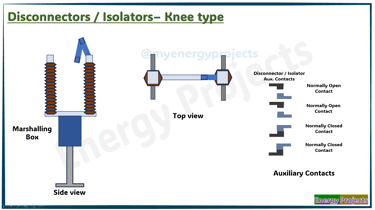 The Knee-Type Disconnector operates through a two-part articulated arm that bends at a joint, allowing the moving contact to pivot away from the fixed contact and interrupt the circuit. It must only be operated when the circuit is de-energized to ensure safe isolation. Please note that the disconnector moves in a horizontal or angular path during operation, utilizing its “knee” mechanism for compact movement within limited vertical space.