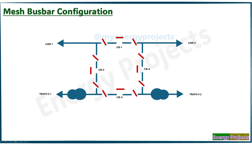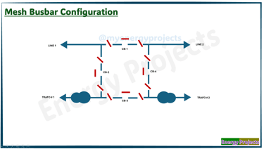A Mesh Busbar Configuration is commonly used in high voltage substations, especially in systems that require high reliability and flexibility. It’s a hybrid between the double busbar and breaker-and-a-half schemes. In a mesh configuration, each circuit (line, transformer, etc.) is connected between two circuit breakers, and those breakers form a “mesh” of interconnected elements.