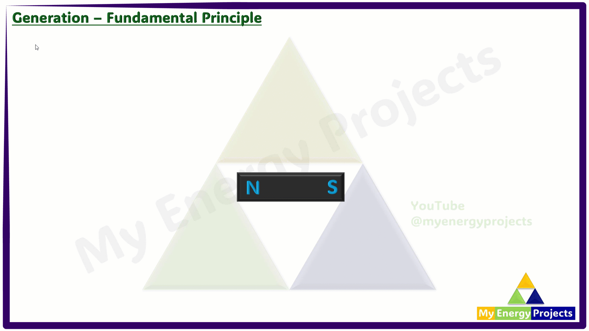 The fundamental principle of electromagnetic induction is the generation of a voltage, or electromotive force (EMF), in a conductor due to a changing magnetic field. As illustrated, an electromagnet produces a magnetic field with flux lines that originate from the north pole and terminate at the south pole. By convention, the north pole is considered a source of positive magnetic energy and the south pole a source of negative magnetic energy.