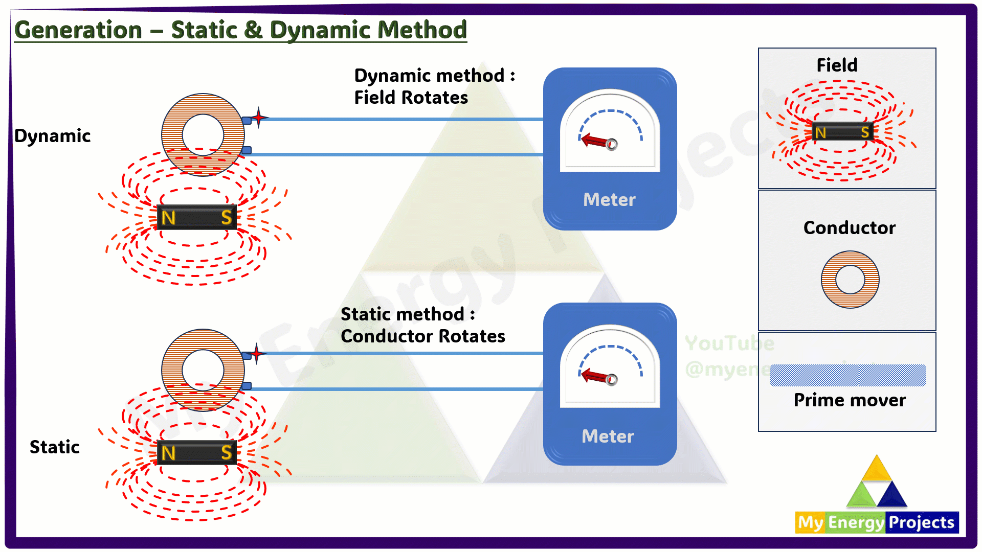 When the magnetic field is fixed and the conductor rotates, it is called static generation, and when the conductor is fixed and the field rotates, it is called dynamic generation.
